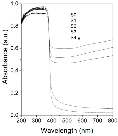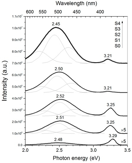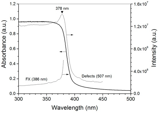Photoluminescence excitation (PLE) spectra of UV and visible emissions observed in sample S4 are shown in Figure 7. It can be seen that the intensity of UV emission (386 nm; 3.21 eV) is sustained once the energy of the incident photons is enough to promote electronic transitions from the conduction to the valence band (>3.2 eV). This is consistent with the excitonic origin assigned to the UV band (i.e., this emission is produced due to recombination of bonded electron-hole pairs). In the case of the visible emission (507 nm; 2.45 eV), excitation wavelengths shorter than 400 nm are required to stimulate it, having a maximum at 378 nm (3.28 eV). This feature indicates that green emission is generated by relaxation of excited electrons located in the conduction band via defect levels (probably VO) and not due to excitation-relaxation processes involving only point defects, as has been previously suggested by other authors [63]. Moreover, the similitude between optical-absorption edge and the green emission onset confirms that its origin is the relaxation of photoexcited electrons from levels at the conduction band.