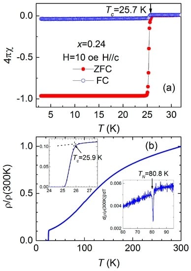 - Böhmer, A.E.; Hardy, F.; Wang, L.; Wolf, T.; Schweiss, P.; Meingast, C. Superconductivity-induced re-entrance of the orthorhombic distortion in Ba1 − xKxFe2As2. Nat. Commun. 2015, 6, 7911. [Google Scholar] [CrossRef] [PubMed]