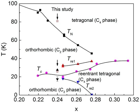 - Wang, L.; Hardy, F.; Böhmer, A.E.; Wolf, T.; Schweiss, P.; Meingast, C. Complex phase diagram of Ba1 − xNaxFe2As2: A multitude of phases striving for the electronic entropy. Phys. Rev. B 2016, 93, 014514. [Google Scholar] [CrossRef]
