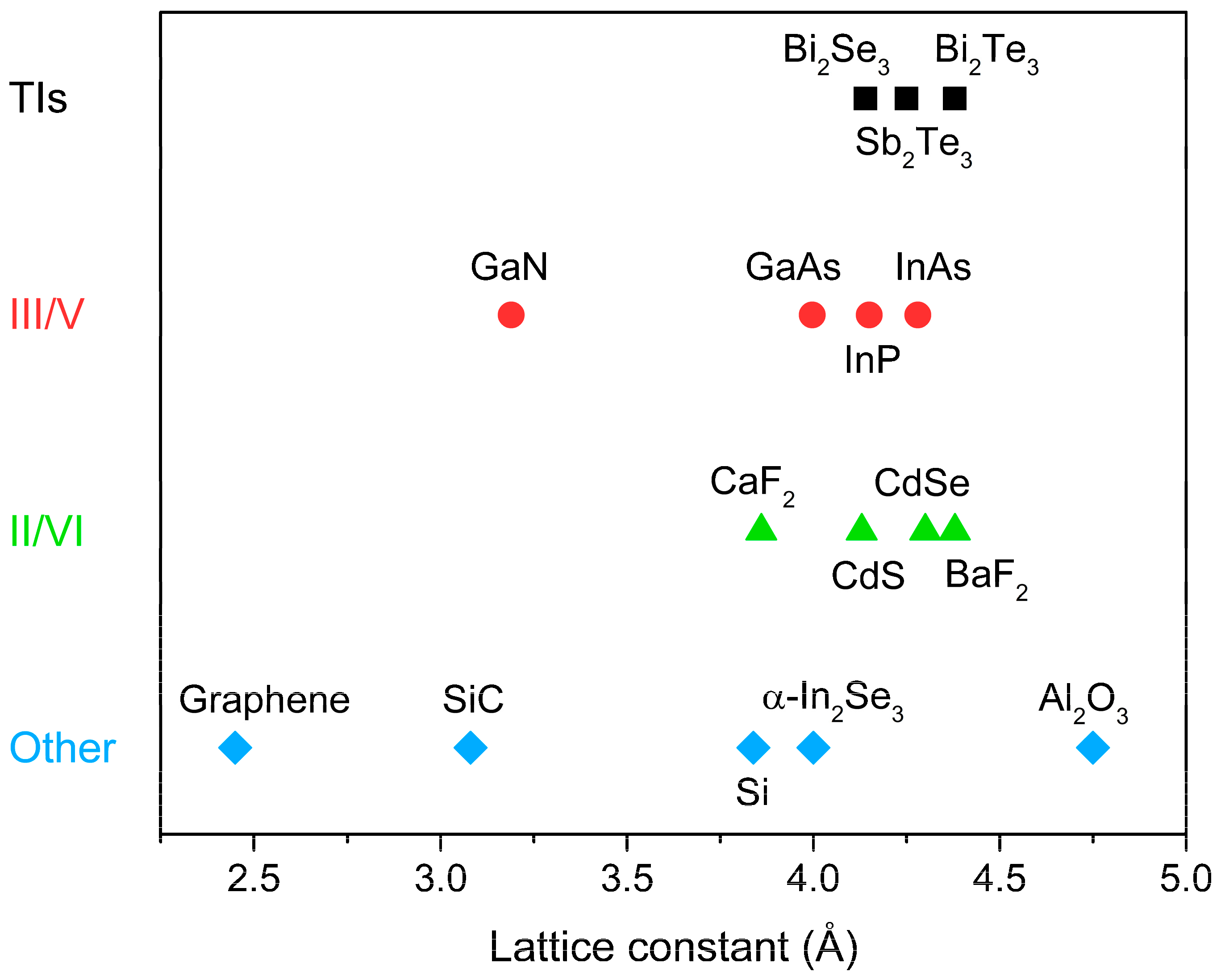 Lattice constants of various substrates compared to lattice constants of binary TIs. For zincblende and cubic structures, the lattice constant of the (111) face is given. For wurtzite structures, graphene, In2Se3 and Al2O3, the lattice constant of the hexagonal (001) face is given.