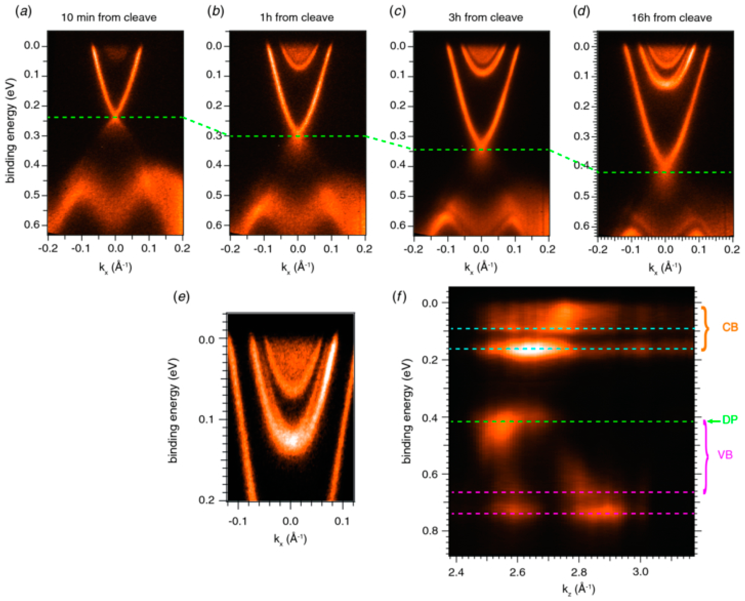 ARPES scans of bulk Bi2Se3 crystals taken at (a) 10 min, (b) 1 h, (c) 3 h and (d) 16 h after cleaving. As time passes, the Dirac point shifts lower and additional conduction band states from band bending become visible. (e) Magnification of the conduction band from (d) showing the Rashba split quantum well states. (f) Photoemission intensity at normal emission as a function of binding energy and kz acquired with a photon energy scan. Reproduced with permission from Bianchi et al., Semiconductor Science and Technology; published by IOP Science, 2012 [50].