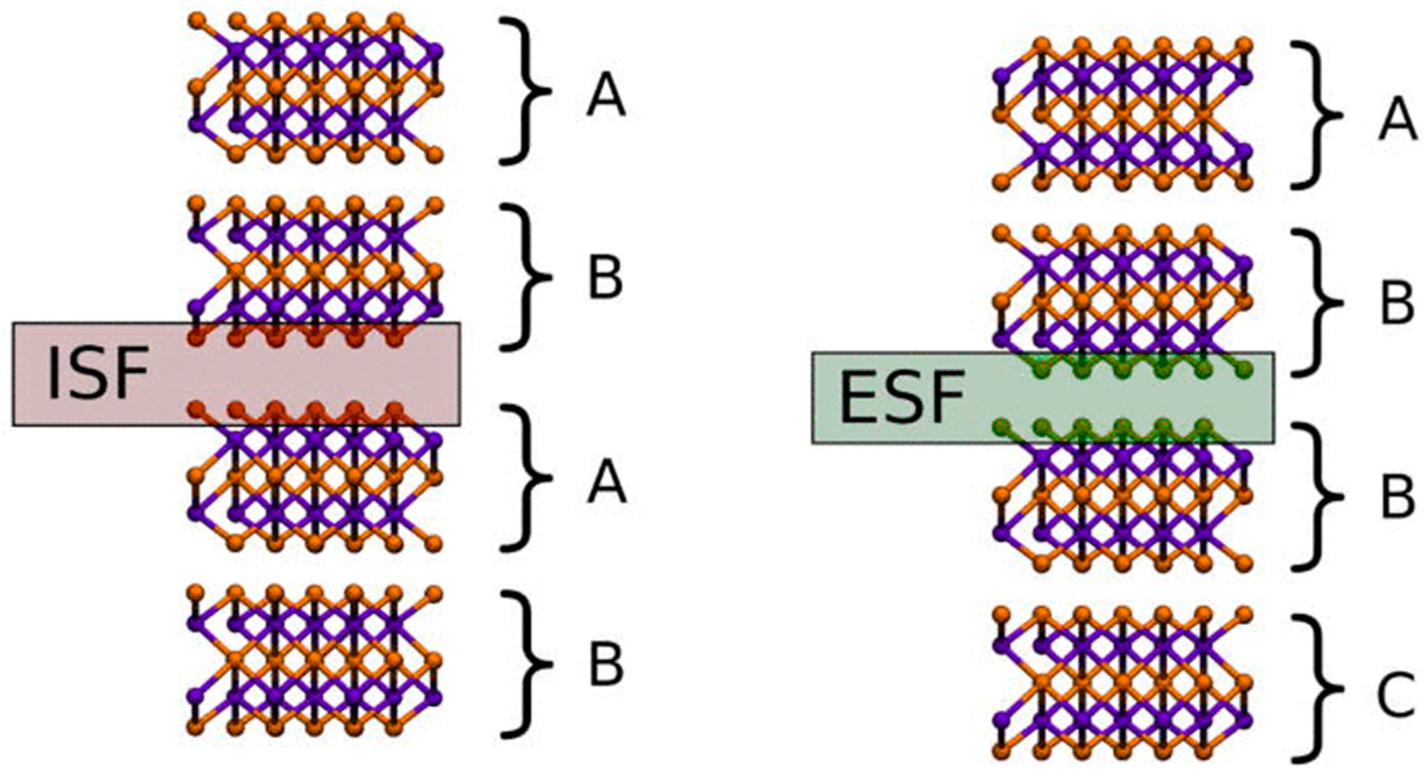 The two types of stacking faults (ISF, or intrinsic stacking fault, and ESF, or extrinsic stacking fault) possible in a TI film. Reproduced with permission from Seixas et al., Journal of Applied Physics; published by the American Institute of Physics, 2013 [55].
