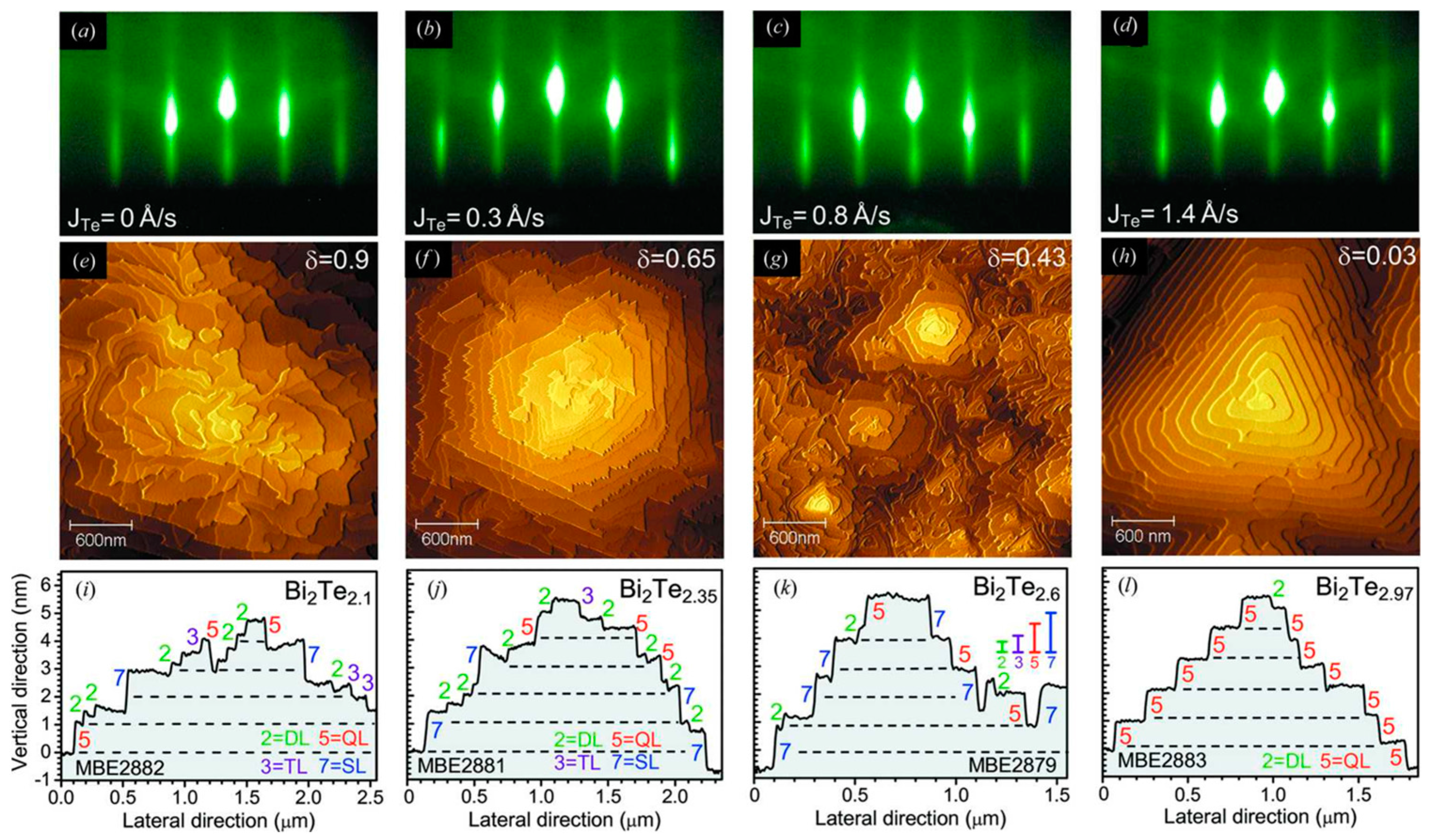 (a–d) RHEED patterns for Bi2Te3 growth with varying Te flux as indicated. (e–h) AFM images corresponding to the Bi2Te3 films grown with the parameters in panels (a–d). (i–l) Step height measurements for the Bi2Te3 films indicating double layers (DL), triple layers (TL), quintuple layers (QL), and septuple layers (SL) Reproduced with permission from Steiner et al., Journal of Applied Crystallography; published by the International Union of Crystallography, 2014 [85].