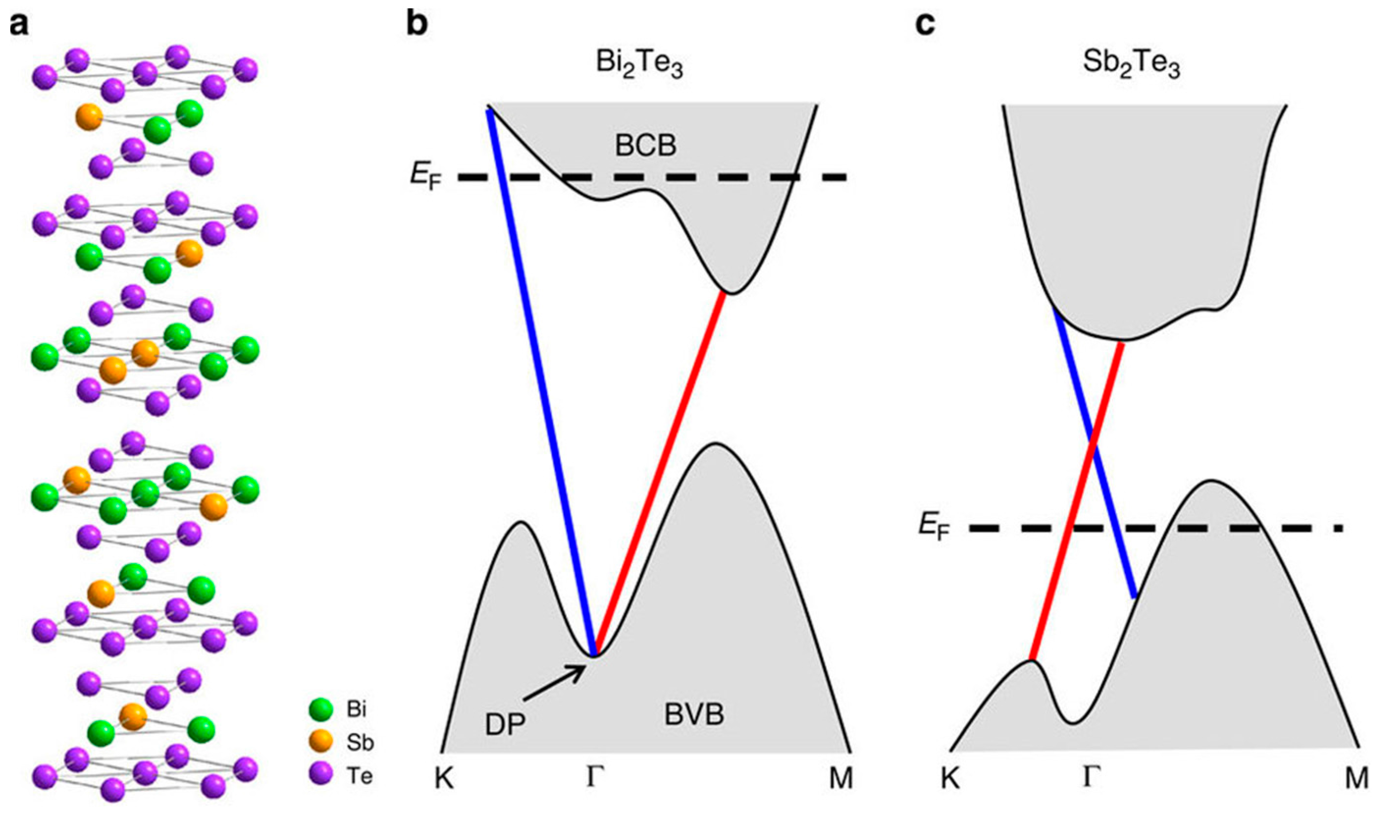 (a) Crystal structure of (BixSb1−x)2Te3 alloy. Bi2Te3 tends to have a Fermi level above the Dirac point as shown by the band structure diagram in (b) while Sb2Te3 tends to have a Fermi level below the Dirac point as shown by the band structure diagram in (c). Alloys are predicted to have a Fermi level tunable across the Dirac point. Reproduced with permission from Zhang et al., Nature Communications; published by Nature Publishing Group, 2011 [119].