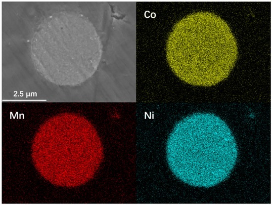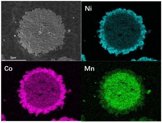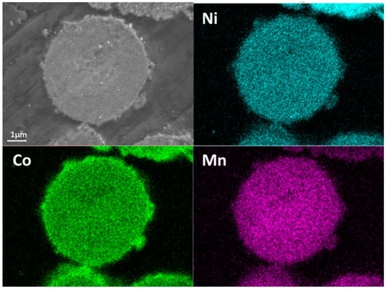 SEM-EDX mapping photograph for Ni, Co and Mn in a single particle obtained by hydrothermal treatment. RM = 1:1:1 (Ni:Co:Mn); C(NH4)2CO3 = 0.1 mol·L−1; Th = 180 °C; and th = 24 h.