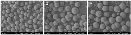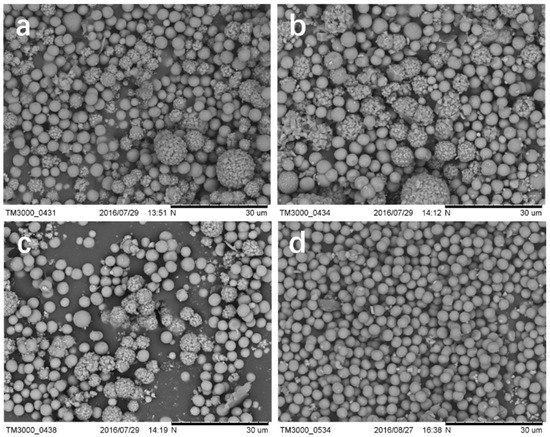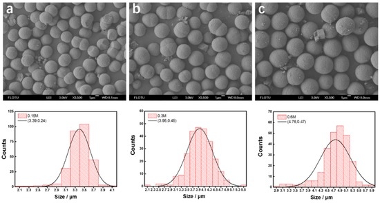 According to the synthesis mechanism metioned above, if we added more primary nanoprecipitates into the autoclave, more metals will be provided for generating larger spherical particles. Therefore, we attempted to tune the size of the final products by changing the concentrations of the starting materials used for primary nanoprecipitate preparation. As seen in Figure 8, when the total concentration of metals (CM) is 0.15 mol·L−1, the average size of final products is 3.39 μm. When we increased CM, the average size becomes 3.95 μm at CM = 0.30 mol·L−1 and 4.76 μm CM = 0.6 mol·L−1. The size of the particles only increases with the increasing of CM, but it does abide by the proportional relation. A possible reason is that more nuclei may be generated in the initial period due to the acceleration of nanoprecipitate dissolution [45]. It can also explain why the size distribution of final product becomes wider with the increase in concentration.