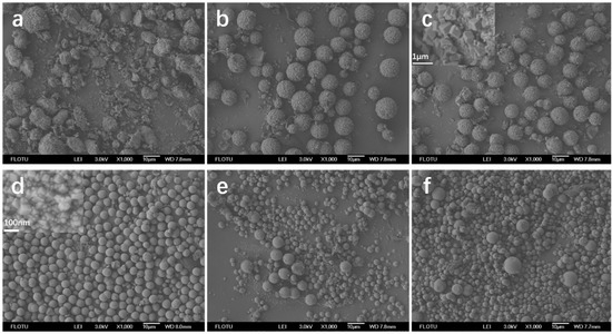 SEM images of the products after hydrothermal treatment in ammonia carbonate of different concentration (C(NH4)2CO3). (a) 0 mol·L−1; (b) 0.05 mol·L−1; (c) 0.10 mol·L−1; (d) 0.15 mol·L−1; (e) 0.25 mol·L−1; (f) 0.30 mol·L−1. RM = 1:1:1 (Ni:Co:Mn); Th = 180 °C; and th = 24 h.