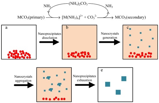 Herein, we proposed a schematic mechanism, as shown in Figure 7, to explain the experimental results based on following three facts: (1) the primary nano-precipitates could partly dissolve in solution; (2) the spherical particles are composed of nanocrystals as the secondary precipitates with crystalline structure different from the primary nano-precipitates; (3) (NH4)2CO3 has remarkable influences on both the dissolution and recrystallization processes. We suppose that the nanocrystals have good thermodynamics stability compared with the primary nano-precipiates and the (NH4)2CO3 in solution could dissociate to release NH3 to accelearte the conversion between them [4,38,44]. The conversion process includes following steps: (1) the primary nano-precipitates dissolve into solution partly to increase the contents of metals in solution to relatively high levels; (2) the nuclei of secondary precipitates generate and grow up to nanocrystals in solution, during which the dissolution of the primary nano-precipitates continue to proceed; (3) the nanocrytals gradually aggregate to lead to the generation and growth of spherical particles in solution; and (4) as all the primary precipitates are consumed, the contents of metals in solution will decrease until the recrystalization process terminates due to the limitation on thermodynamics equilibrium.