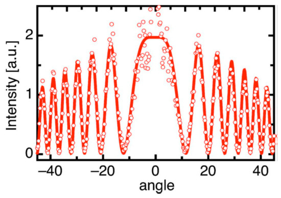 (Color online) Maker-fringe curve obtained by rotating a c plate 4-N,N-dimethylamino-4′-N′-methyl-stilbazolium 2,4,6-trimethylbenzenesulfonate (DSTMS) crystal around the dielectric x1 axis. The impinged fundamental beam at 1.9 μm as well as the generated second-harmonic light at 0.95 μm were s polarized [27].