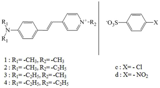 Inside D-π-A conjugated organic ionic species, the cation is the main source of nonlinear properties, whereas the counter-anion is used to adjust the crystal packing through coulombic interactions [14,15,16,17]. The suitable combination of cation and counter-anion would lead to high second-order optical nonlinearity. Stilbazolium organic salt occupy an important position in the field of nonlinear optics owing to their larger nonlinear optical effect. Especially, 4-N,N-dimethylamino-4,-N,-methyl-stilbazolium tosylate (DAST); this is one of the best NLO crystals with large second-order nonlinear optical susceptibilities χ111(2) = 2020 ± 200 pm/V at 1.3 μm and χ111(2) = 420 ± 110 pm/V at 1.9 μm due to the appropriate orientation of the chromophores in the crystal [18,19,20]. DAST consists of a positively charged nonlinear optical chromophore stilbazolium and a negatively charged tosylate anion. However, the upper limits of theoretical calculated macroscopic susceptibilities for DAST are by far not yet achieved [21]. Besides, the growth of highly nonlinear optical quality bulk or thin films of DAST single crystals still remains an urgent challenge. It usually takes one or two months to grow high-quality and large-size DAST crystals, and the growth process requests high precision in temperature fluctuations. Therefore it is desirable to develop new organic crystals with larger NLO properties and better crystal growth abilities compared with those of DAST [22].