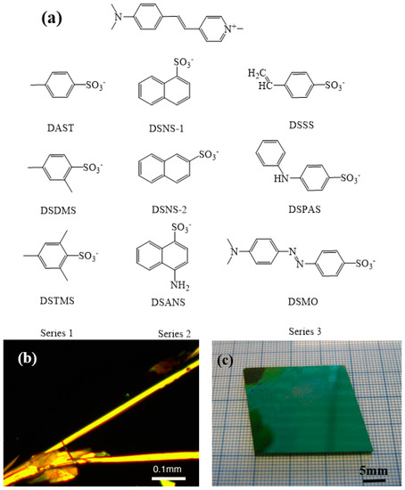 Molecule structures of the stilbazolium derivatives (a) and single crystals of 4-N,N-dimethylamino-4′-N′-methyl-stilbazolium 2-naphthalenesulfonate (DSNS) (b) and 4-N,N-dimethylamino-4′-N′-methyl-stilbazolium 2,4,6-trimethylbenzenesulfonate (DSTMS) (c).