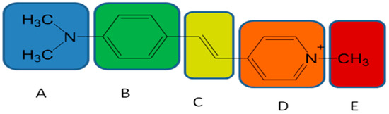 The benzene of the electron donor and the pyridine of the electron acceptor are ideal combinations for one other in the cation of DAST. So at the beginning of grouping of changes of the DAST cation, most researches were inclined to replace part A and E as mentioned below, while the main channel of electron transport was not changed. The significantly large χ(2) values of the above-mentioned ionic organic crystals are due to high β values of stilbazolium cations and due to preferred non-centrosymmetric packing. Generally, the large β values of ionic chromophores are mainly provided by strong electron acceptor and electron donor characteristics of the cation parts. Thus ionic π-conjugated species can be highly polarized when an appropriate substituent is introduced into the cation parts. Therefore, numerous studies on modifying the cation of stilbazolium compounds have been carried out and some interesting achievements have been attained [37,38,39]. As shown in Figure 4, the cation of DAST could be divided into five parts (A–E). Many research investigations have been concentrated on changing some of the five parts to improve the second order nonlinear property of the cation molecule.