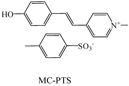 Molecular structure of 1-methyl-4(2-(4-hydroxyphenyl)vinyl) pyridinium 4-toluenesufonate (MC-PTS).