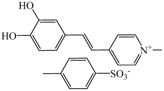 The compound 3′,4-dihydroxy-4-N-methylstilbazolium tosylate (Figure 6) was prepared by Marder et al. in the early days [41]. A large powder SHG efficiency of 0.1 times of DAST was observed for this compound. X-ray studies exhibited that this crystallizes in the triclinic space group P1 with one cation and one anion in the unit cell.