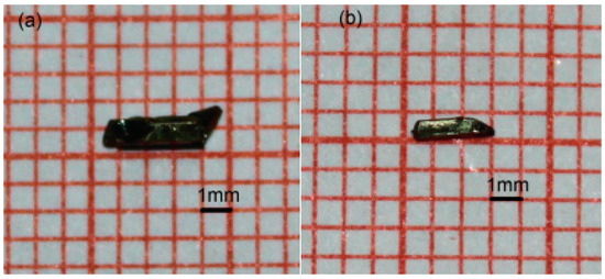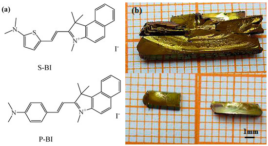 Chen et al. introduced benzindole to substitute the generally used pyridinium as electron acceptor in the conjugated molecule. Bulk single crystals of P-BI were obtained with sizes of up to 17.0 × 6.0 × 2.0 mm3 using the slow evaporation method as shown in Figure 16. Kurtz powder tests revealed that the maximum powder SHG efficiency of P-BI with the monoclinic space group P21 is 1.14 times the benchmark DAST. Besides, they changed the electron conjugated channel into thiophene. S-BI-1 and S-BI-2 (methanol and ethanol solvent, respectively) were obtained by slow evaporation crystal growth method. The powder SHG efficiency was found to be 0.23 times that of DAST. There is only a small difference in π-conjunction between the molecular structure of P-BI and S-BI but it is accompanied by a large change of molecular ordering in the crystalline state and a substantial change of macroscopic physical properties. These results demonstrate that the crystal packing of this type of salt is very sensitive to the nature of the molecular structure [62].
