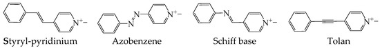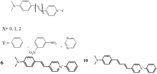 For DAST derivatives, it is common to use methyl groups in Part E. Few works have been reported on substitutions of Part E. Coe et al. substituted the methyl by a few other groups. They synthesized a total of sixteen dipolar salts comprising four separate series, each of which includes four different N-substituted pyridinium electron acceptor structures (Figure 21). Almost all of the salts designed crystallize centrosymmetrically, leading to crystals without second-order NLO effects. Fortunately, molecules (6) and (10) adopt the polar space group CC and show SHG activity of 0.8 and 1.0 times that of DAST [66,67]. Second-order NLO susceptibility of crystals made of chromophore (6) with PF6-counter anion higher than that of DAST have been reported [68].