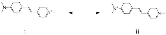 Styryl-pyridinium is one of the most efficient electron delocalized conjugated skeletons. So far most of the reported NLO molecules include this fragment. The carbon and nitrogen atoms on the pyridine ring of styryl-pyridinium are in sp2 hybrid orbitals, each atom on the ring forms a conjugated system with one π orbital without a lone pair of electrons on the nitrogen atom. Therefore, the formation of stilbazolium does not destroy the cyclic conjugated system. Marder [48] pointed out that the NLO molecule charge transfer mechanism was considered to be achieved by resonance of two limiting forms, ground state and excited state. Second-order molecular polarizabilities tend to be larger as the energies of these two limiting forms are close to each other; such as dimethylamino-styrylpyridinium (Figure 12). The molecules lost aromaticities from conjugated form (i) to conjugate form (ii). However, as first approximation (ignoring the interaction of the corresponding anion), intramolecular charge-transfer is not just as isolated or as neutral molecules. The energy of the two kinds of styryl-pyridinium conjugate forms is close compared with the neutral molecule, which could improve hyperpolarizability β values.