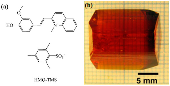 Shortly afterwards, new efficient nonlinear optical quinolinium-based single crystals OHQ-TMS were developed by the same group. Remarkably high effective hyperpolarizability tensor values of 27 × 10−30 esu were obtained for these crystals. Plate-shaped bulk quinolinium crystals with an area of up to 56 mm2 were successfully grown by the solution growth method as shown in Figure 20. The crystal structure of monoclinic acentric space group P21 symmetry was obtained by XRD measurement. As-grown OHQ-TMS crystals exhibit a large transparency range from 550 nm to 1600 nm in the optical region and a relatively low absorption coefficient in the THz region. Thus OHQ-TMS crystals are prospective materials for use in second-order NLO applications [65].