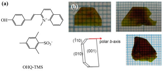 There has been considerable interest in organic nonlinear optical (NLO) materials with large second-order optical nonlinearities due to their attractive potential applications in optical frequency conversion, integrated photonics, high-speed information processing, and THz wave generation and detection [1,2,3]. These materials have low dispersion of their dielectric constants (refractive index) and nonlinear optical susceptibility from direct current (low frequency) to the optical frequency range, because of their dominant electronic contribution to linear and nonlinear optical material polarizability [4,5,6,7]. This permits an ultra-fast polarizability response time compared to inorganic materials, whose dominant response usually comes from intrinsically slower acoustic and optical lattice vibrations. Additionally, the nonlinear optical figures of merit of organic materials may be several orders of magnitude higher than those of their inorganic counterparts and they have almost unlimited design possibilities [8,9]. All these advantages make organic NLO materials extremely attractive for the above mentioned applications. It has become an important research focus to design and synthesize new organic NLO materials with excellent performance. Among them, single crystals are one of the most attractive materials owing to their typically large macroscopic nonlinearities, high packing densities, and excellent long-term orientational and photochemical stabilities, as well as their superior optical quality.