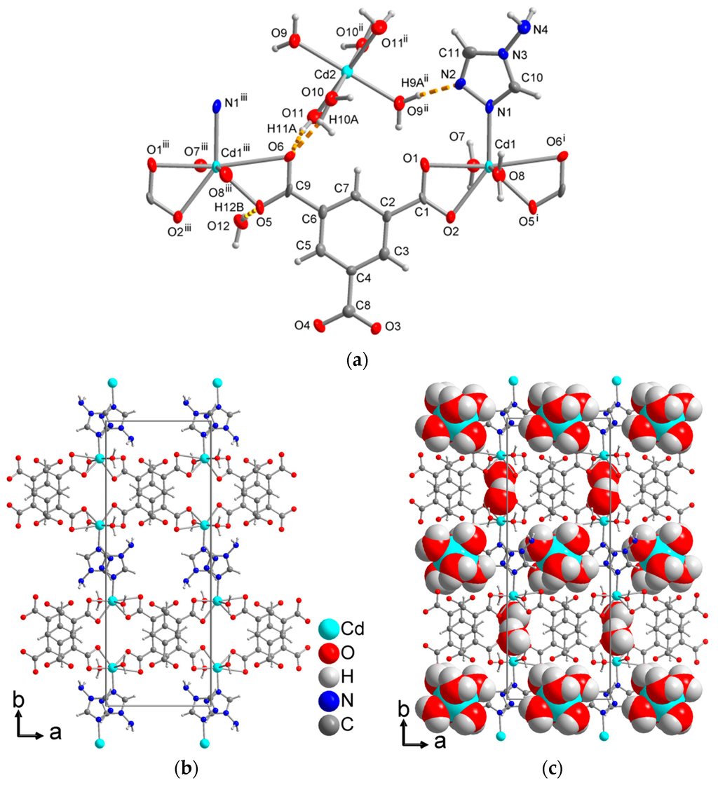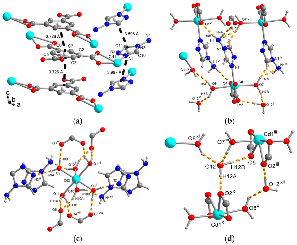 The Cd1 ion forms a coordination polymeric chain with benzene-tricarboxylate (btc3–), 4-amino-1,2,4-triazole (atr), and two aqua ligands. The Cd1 atom is seven-fold coordinated in a distorted pentagonal-bipyramidal fashion by a triazole nitrogen atom of atr and six oxygen atoms; two of them belong to axial aqua ligands. The other four O-atoms come from the carboxylate groups of two fully deprotonated btc3– ligands, which coordinate in a bidentate chelating mode. The O-atoms of btc3– and the N-atom of atr form the equatorial plane of the pentagonal bipyramid. One of these chelated Cd–O bonds is slightly longer (Cd1–O6 = 2.766(5) Å) than the range of the other Cd–O bonds (Cd1–O = 2.258(5)–2.412(5) Å). The atr ligand coordinates to Cd1 through the imine N1-atom of the triazole ring as a terminal ligand; the other imine N atom (N2) and the amino group remain without Cd coordination but engage in hydrogen bonding (see below). The tri-anionic btc3– ligands coordinate as bridges between two Cd1 atoms to form the one-dimensional mixed-ligand chain (Figure 1b); the third carboxylate group remains uncoordinated but is part of the hydrogen-bonding network. This chain is a polyanion and has the formula of [Cd2(atr)2(µ2-btc)2(H2O)4]n2–. Charge neutrality is reached by one hexaaquacadmium(II) cation, [Cd(H2O)6]2+ as equivalent for each of the two Cd1 atoms. The Cd2 atom in [Cd(H2O)6]2+ sits on an inversion center as a special position (Figure 1a). Hexa-coordinated cadmium can have a coordination environment in-between octahedral and trigonal prismatic [30,31]. Here, the Cd2 atom has a slightly distorted octahedral environment of six water molecules. Two crystal water molecules per formula unit of 1-D {[Cd(H2O)6][Cd2(atr)2(μ2-btc)2(H2O)4] 2H2O}n complete the packing (Figure 1c).