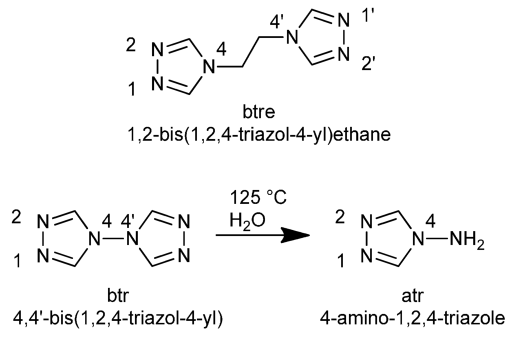 Coordination polymers based on mixed-linkers allow for a fine-tuning of MOF properties and can show additional characteristics such as crystal-to-crystal transformations [19], short and long-range magnetic ordering [20], luminescence [21], etc. [22]. The combination of neutral nitrogen donor ligands with anionic carboxylate ligands are frequent choices for the synthesis of mixed-ligand networks [22]. The linker 1,2-bis(1,2,4-triazol-4-yl)ethane (abbreviated as btre, Scheme 1) has recently been intensely studied in mixed-linker MOFs [19,20,21,22,23,24] and single-linker networks [25]. Herein, we report an attempt to construct a mixed-linker network with the 4,4′-bis(1,2,4-triazol-4-yl) (btr) ligand which was not hydrothermally stable under the synthesis conditions of 125 °C in water, so that the hydrolysis product 4-amino-1,2,4-triazole (atr) was incorporated instead (Scheme 1).