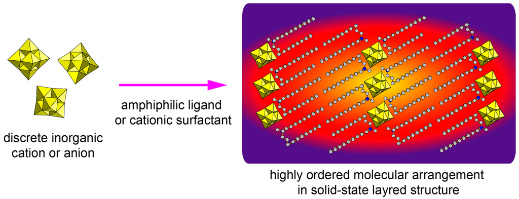 Polyoxometalates (POMs) are a vast class of molecular oxide cluster anions, the main constituents of which are early transition metals [18]. POMs have a wide variety of physicochemical properties [8,9,18,19,20,21,22,23,24,25,26], and are promising candidates as inorganic components to construct hybrid surfactant single crystals. POMs have been hybridized with cationic surfactants to build up inorganic–organic hybrid materials [98,99,100,101,102,103,104,105,106]. POM-surfactant hybrids can allow fine tuning of the structure and function by changing the combination of POM anion and surfactant cation. Several properties have been investigated as amphiphilic [98,99,100], magnetic [101], catalytic [102], electrochemical [103], and photoluminescent [103,104,105,106] materials.