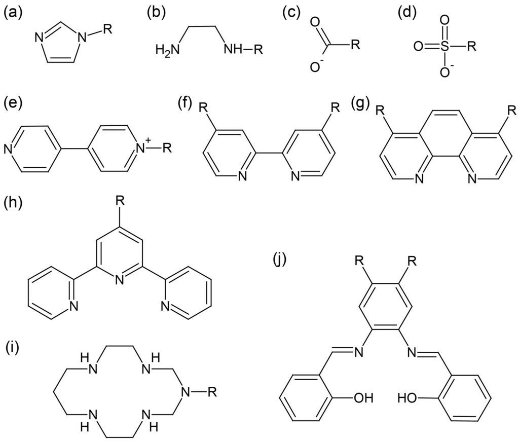 Selected ligands employed in the hybrid surfactant single crystals composed from discrete metal cations: (a) imidazole; (b) ethylenediamine; (c) carboxylato; (d) sulfonato; (e) 4,4′-bipyridyl; (f) 2,2′-bipyridine; (g) 1,10-phenanthroline; (h) terpyridine; (i) 1,3,5,8,12-pentaazacyclotetradecane; (j) Schiff base. R in the scheme represents amphiphilic moiety.
