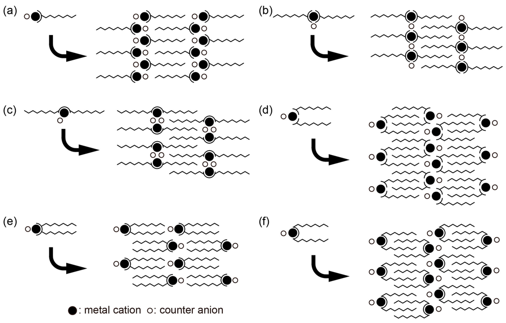 Some of their coordination and packing modes are schematically extracted (Figure 4). The coordination mode depends on the number of surfactant ligands to coordinate to the metal cation, and on the number of amphiphilic chains of each ligand. Here, the coordination mode does not mean accurate coordination geometry. There are six typical coordination and packing modes: asymmetric coordination of one single-chained ligand (Figure 4a) [38,39,55,61,65], symmetric coordination of two single-chained ligands lying on the opposite sides of the metal cation (Figure 4b) [41,42,43,49,51,53,55,59,60], symmetric coordination of one double-chained ligand with two chains at the opposite sides of the metal cation (Figure 4c) [45,47,54,55,62], asymmetric coordination of two single-chained ligands lying on the same side of the metal cation (Figure 4d) [44,46,48,56], asymmetric coordination of one double-chained ligand with narrow space between the chains (Figure 4e) [50,54,63], and asymmetric coordination of one double-chained ligand with wide space between the chains (Figure 4f) [41]. However, the essential feature is the formation of a layered structure that consists of Mn+ inorganic layers and surfactant organic layers. The long amphiphilic chains are densely packed with or without interdigitation, which depends on the chain length and structure of coordinating moiety. Some ligands possess asymmetric coordination mode (Figure 4a,d–f); however, they usually form symmetric packing in the single crystals. Although it is difficult to strictly categorize these coordination and packing modes due to the variety of the ligand structures, monodentate ligands coordinate in both a symmetric and asymmetric manner (Figure 4a,b). On the other hand, bidentate and tridentate ligands seem to prefer symmetric coordination modes (Figure 4b,c)