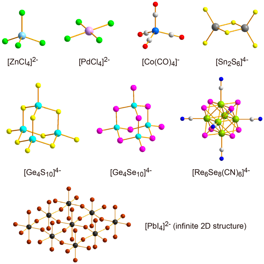 Several discrete inorganic anions employed to construct hybrid surfactant single crystals with cationic surfactants. Oxide cluster anions are represented separately in Figure 8.