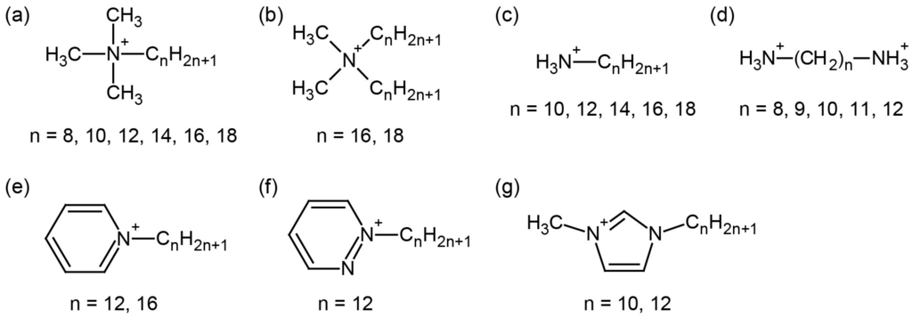Several cationic surfactants employed to construct hybrid surfactant single crystals with discrete inorganic anions: (a) alkyltrimethylammonium; (b) dialkyldimethylammonium; (c) alkylammonium; (d) alkyldiammonium; (e) alkylpyridinium; (f) alkylpyridazinium; (g) 1-alkyl-3-methylimidazolium.