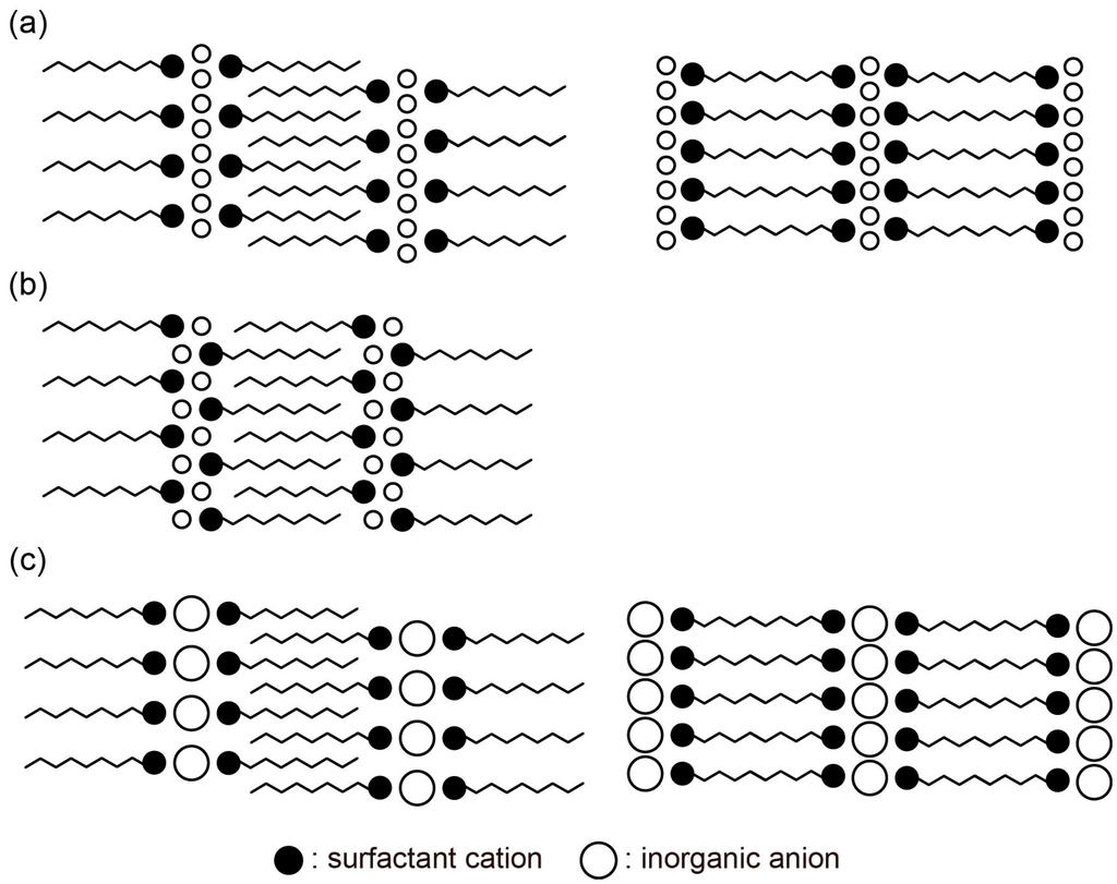 The hybrid surfactant crystals containing monomeric inorganic anions typically form layered packing, as shown in Figure 7a. The packing manner comprises alternate stacking of inorganic monolayers and organic surfactant layers. The single-headed surfactant forms a bilayer arrangement to realize a dense packing of long alkyl chains (Figure 7a, left), while the double-headed surfactant forms monolayer structures (Figure 7a, right). When a single-headed and single-chained surfactant is employed, the inorganic layers sometimes form a bilayer structure, probably due to the small size of monomeric ions (Figure 7b) [74,75,79,80]. To compensate for the negative charge of the inorganic anion, the charged hydrophilic heads of the surfactant come close to the anion. The small monomeric anions are necessary to form a bilayer arrangement to increase the number of surfactant cations associated with the monomeric anions.