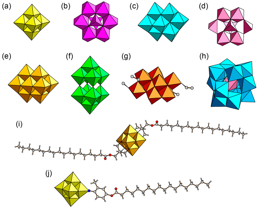 POMs employed for the construction of hybrid surfactant single crystals: (a) [Mo6O19]2− (Mo6); (b) α-[Mo8O26]4− (α-Mo8); (c) β-[Mo8O26]4− (β-Mo8); (d) δ-[Mo8O26]4− (δ-Mo8); (e) [V10O28]6− (V10); (f) [W10O32]4− (W10); (g) [γ-Mo8O24(OC2H5)4]4− (γ-Mo8); (h) [SiMo12O40]4− (SiMo12); (i) [V6O13{(OCH2)3CCH2OOC(CH2)16CH3}2]2−; (j) [Mo6O18(N-C6H3-2-(CH3)-4-OCOC17H35)]2−.