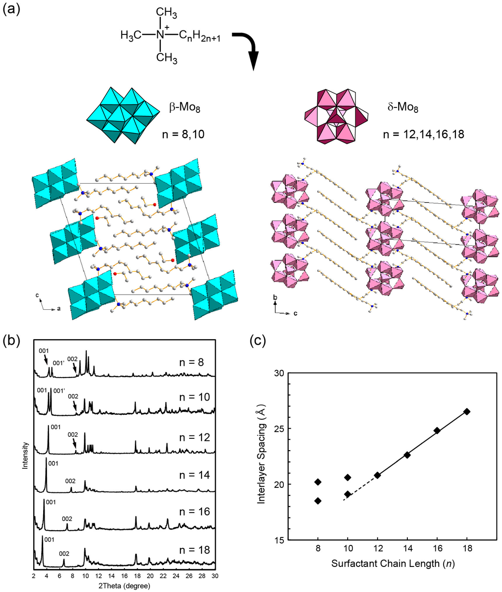 The layered structures are controllable by changing the length of surfactant alkyl chain [125]. The case of hybrid crystals comprising Mo8 and CnNC3 (n = 8, 10, 12, 14, 16, 18) is shown in Figure 9. Interestingly, there are two types of homologue structure, which change owing to the surfactant length (Figure 9a,b). Shorter surfactants prefer β-Mo8 isomer, while longer ones prefer δ-Mo8 isomer, conceivably due to the effect of van der Waals interactions between the surfactant alkyl chains. Such a structural change in isomer molecules induced by the surfactant chain length is rather unique. The layered distances of the CnNC3-δ-Mo8 crystals (n = 12, 14, 16, 18) depend linearly on the surfactant length (Figure 9c).