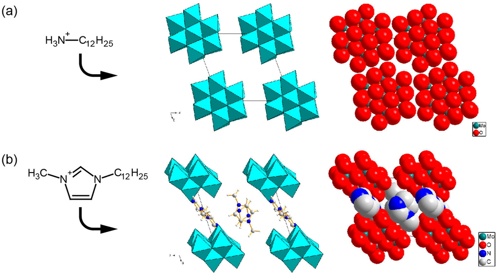 Molecular arrangements of the inorganic layers in β-Mo8 hybrid crystals. The same arrangements are depicted in polyhedral (left) and space-filling (right) representations. (a) C12NH3-β-Mo8; (b) C12mim-β-Mo8 [123]. Reproduced with permission from Ito, T. et al., Chem. Lett.; published by The Chemical Society of Japan, 2013.