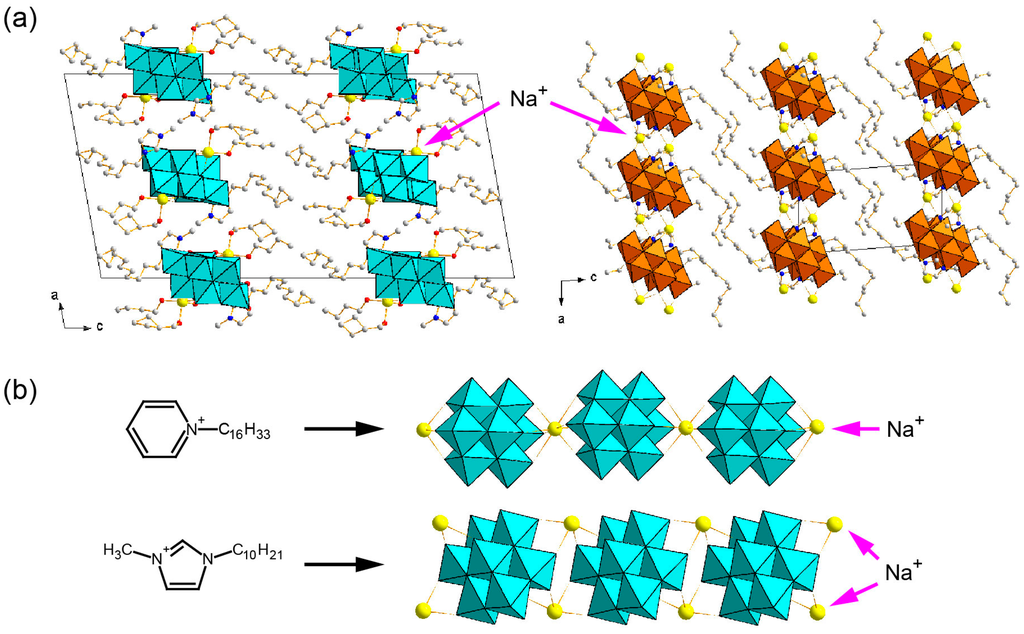 Sodium ion-containing POM-surfactant crystals. (a) C10mim-β-Mo8 (left) and C12mim-γ-Mo8 (right); (b) difference in the arrangements of β-Mo8 anion and sodium cation depending on the surfactant cation [120,121,124]. Reproduced with permission from Ito, T. et al., Chem. Lett.; published by The Chemical Society of Japan, 2010; from Ito, T. et al., Chem. Lett.; published by The Chemical Society of Japan, 2011; and from Ito, T. et al., Crystals; published by MDPI, 2014.