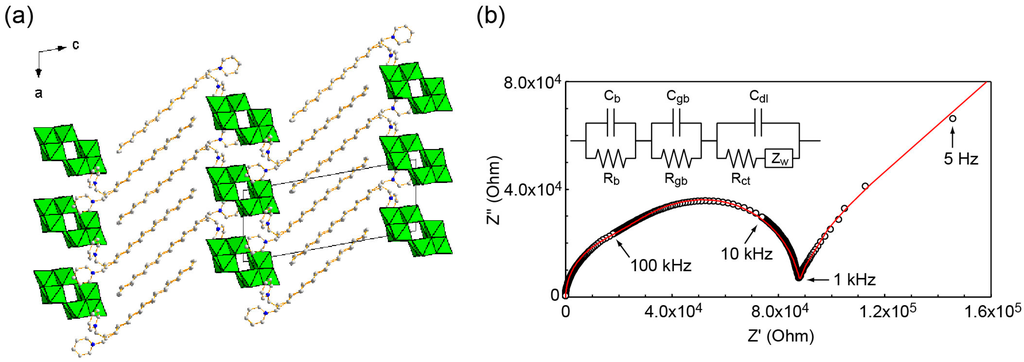 Crystal structure and conductive property of C16py–W10 hybrid crystals. (a) Crystal packing; (b) Nyquist spectrum (open circles) at 423 K and simulated spectrum (red line) based on an equivalent electronic circuit [127]. Reproduced with permission from Ito, T. et al., Crystals; published by MDPI, 2012.