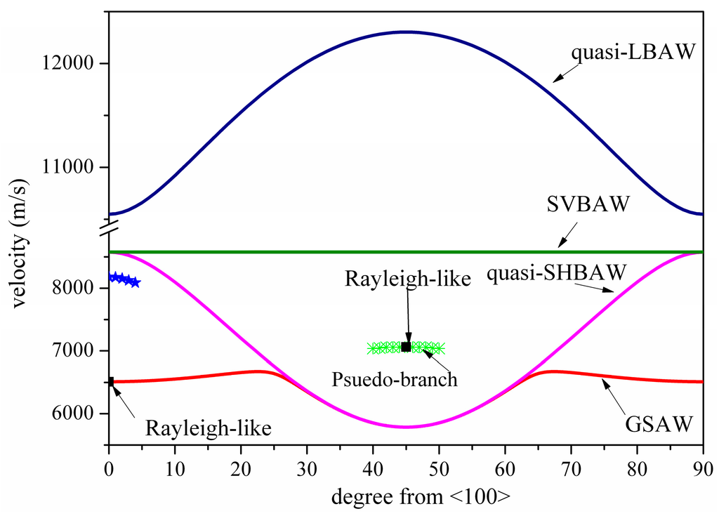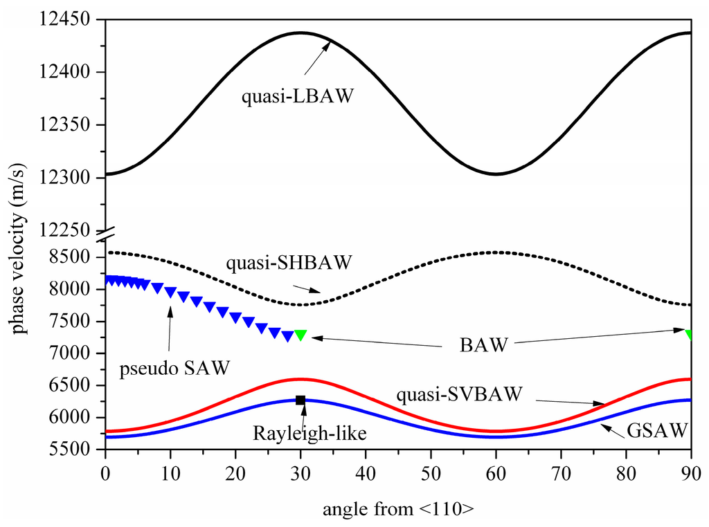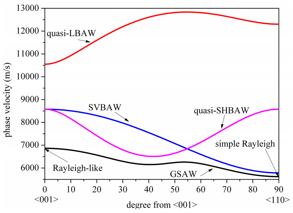 The phase velocity of the surface and bulk acoustic waves propagating in the (001) plane of 3C-SiC was calculated for different propagation directions, as shown in Figure 1.