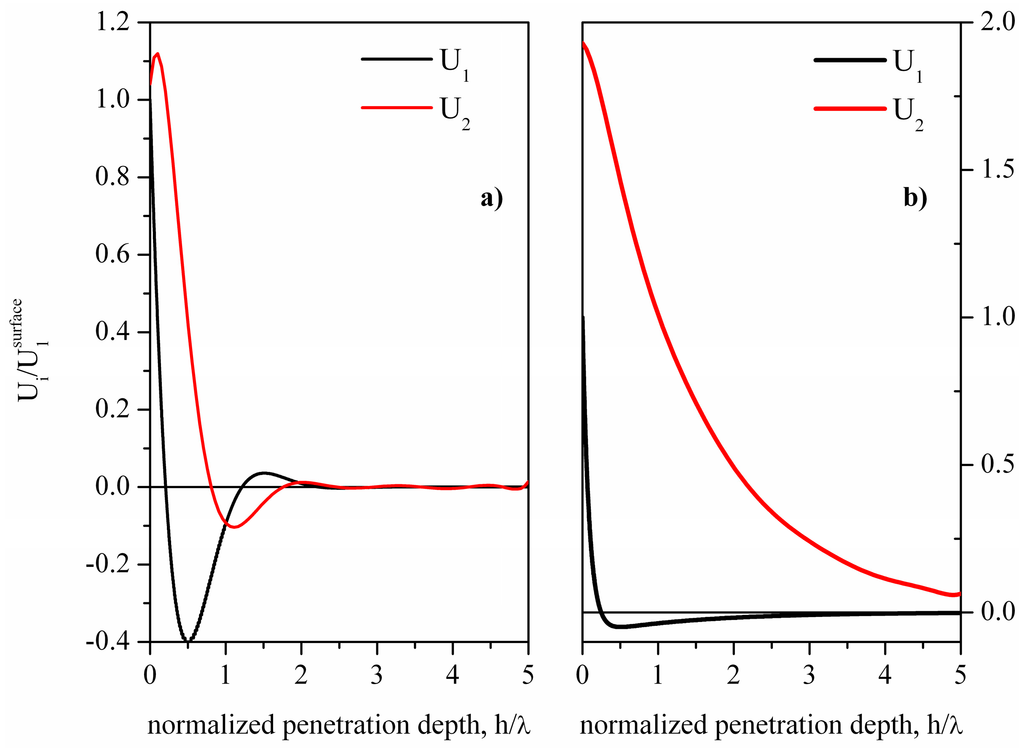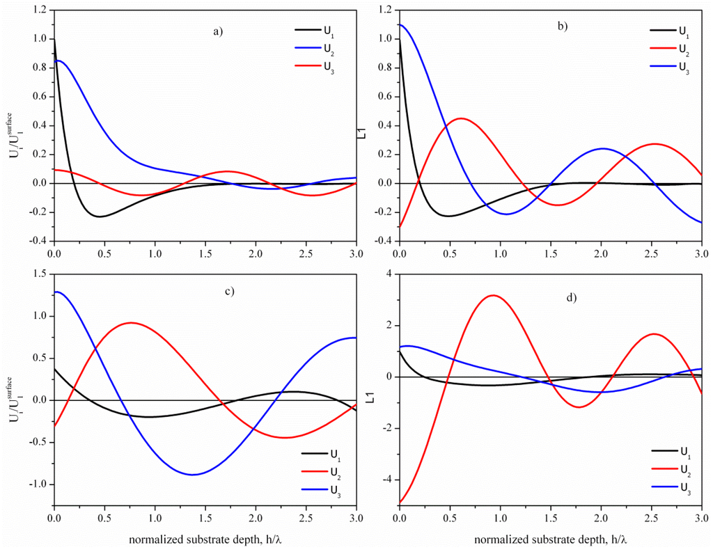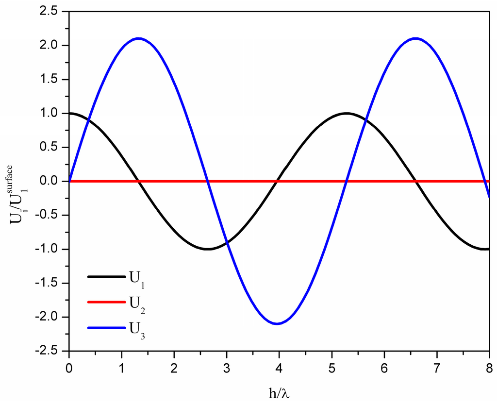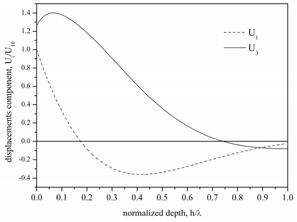 Along the <001> direction of the (110) plane, a Rayleigh-like mode propagates with two displacement components U1 and U3 vanishing with depth in an oscillatory way, as shown in Figure 10a. Along the <110> direction, a simple Rayleigh wave propagates [] with two displacement components U1 and U3, slowly damping into the bulk, as shown in Figure 10b.