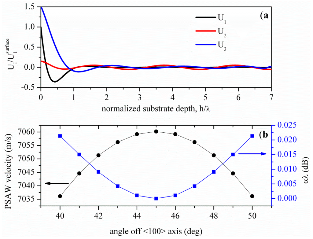 (a) Variation of the normalized shear and longitudinal displacement components with depth for the PSAW propagating at 49° off the <100> directions of the (001) plane of SiC; (b) the PSAWs velocity and propagation loss vs. the angle off the <100> direction of the (001) plane of SiC.