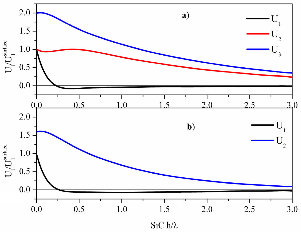 Variation of the normalized shear and longitudinal displacement components with depth of the Rayleigh-like wave propagating along <001>(110)SiC (a) and of the simple Rayleigh wave propagating along <110>(110)SiC (b).