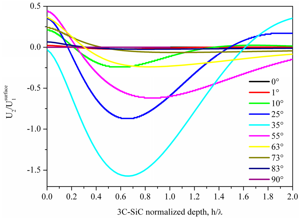 For propagation directions between <001> and <110>, a GSAW propagates with three displacement components U1, U2 and U3. The U2 component amplitude increases from 0° to 45° off <001> because of the approaching of the GSAW and SHBAW velocities, while it decreases from 45° to 90° with the increasing of the velocity difference between the GSAW and SHBAW. The U2 component vs. the SiC normalized depth is shown in Figure 11, for different propagation directions in the (110) plane.