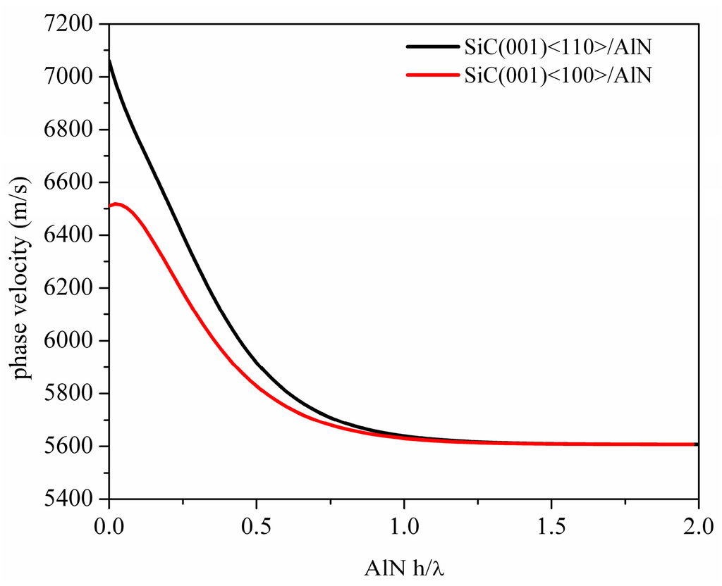 In a film/substrate structure, the acoustic wave propagation properties become dispersive with respect to the thickness of the layer. As a result, in the SiC/AlN multilayer structure, the SAW propagation properties would be dispersive with respect to the AlN film thickness normalized to the wavelength. Moreover, the phase velocity dispersion curves of SAW propagating along different directions in different planes of the SiC substrate covered by an AlN layer are not identical due to the cubic crystal system of the SiC half-space.