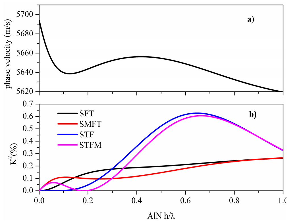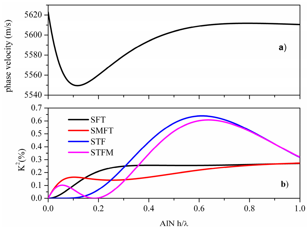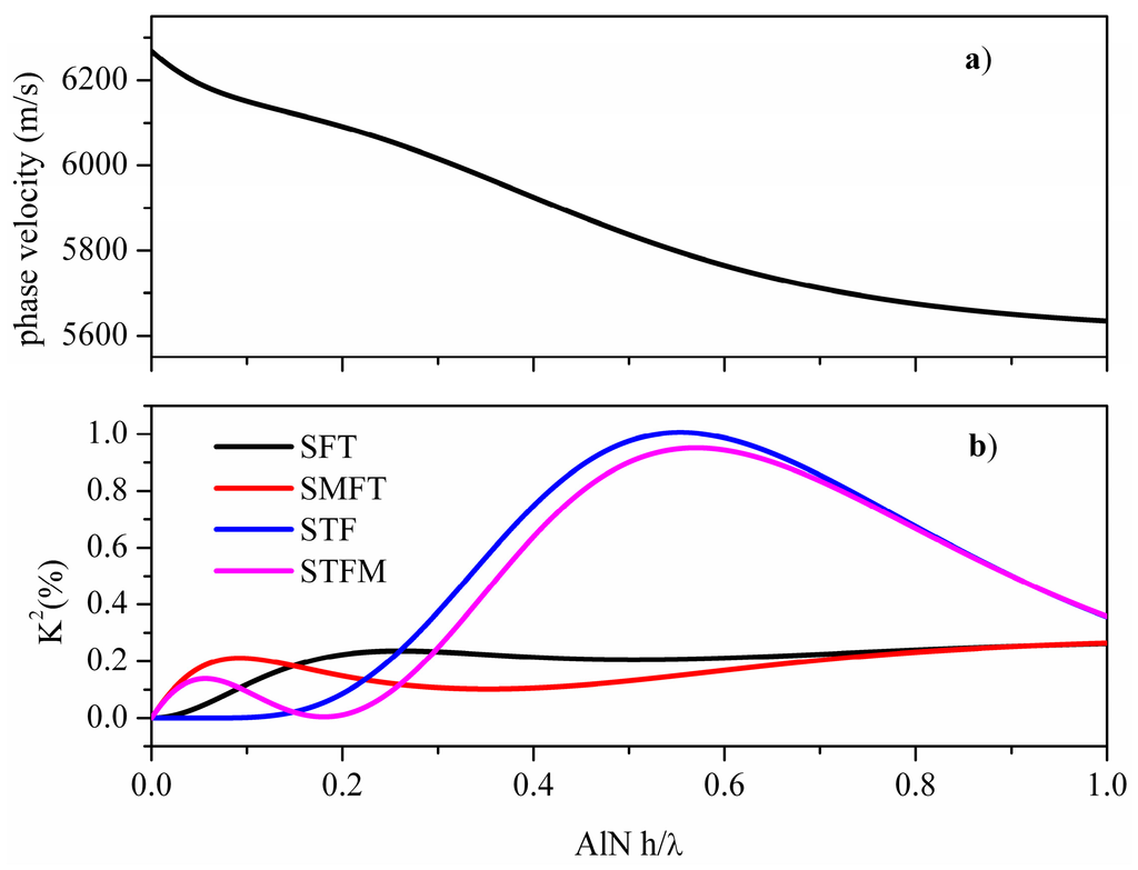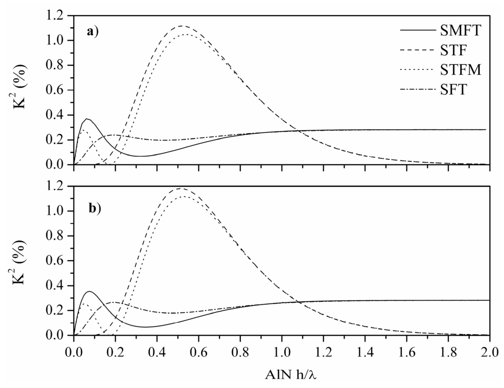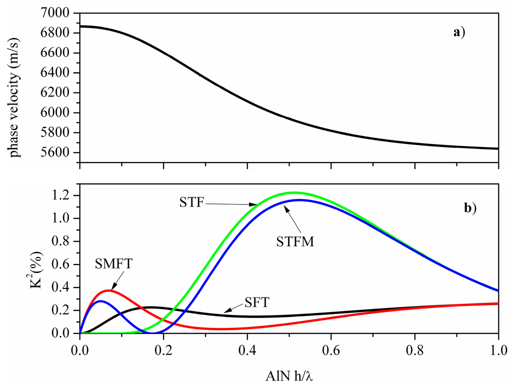 As it can be seen from Figure 13, the K2 dispersion curves are strongly affected by the electrical boundary conditions that influence the potential depth profile. For acoustic waves propagating along layered structures, the achievable K2 can be larger than that of AlN (0.3%) considered as a semi-infinite substrate, due to an increased acoustic energy confinement. Between the four coupling structures, the STFM and STF structures exhibit the highest K2 value for an AlN normalized thickness equal to about 0.5.