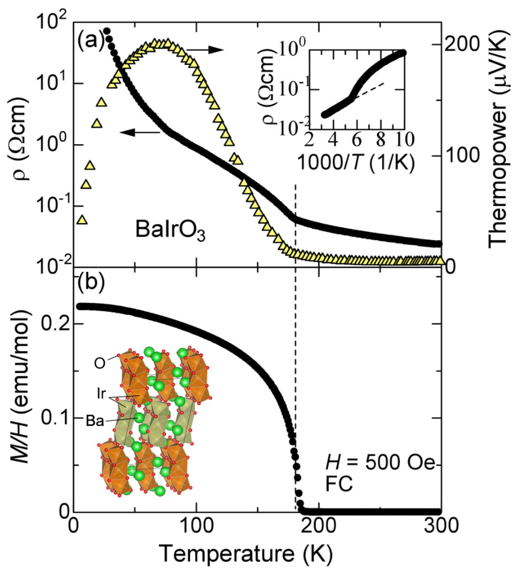- Cheng, J.G.; Zhou, J.S.; Alonso, J.A.; Goodenough, J.B.; Sui, Y.; Matsubayashi, K.; Uwatoko, Y. Transition from a weak ferromagnetic insulator to an exchange-enhanced paramagnetic metal in the BaIrO3 polytypes. Phys. Rev. B 2009, 80, 104430. [Google Scholar] [CrossRef]