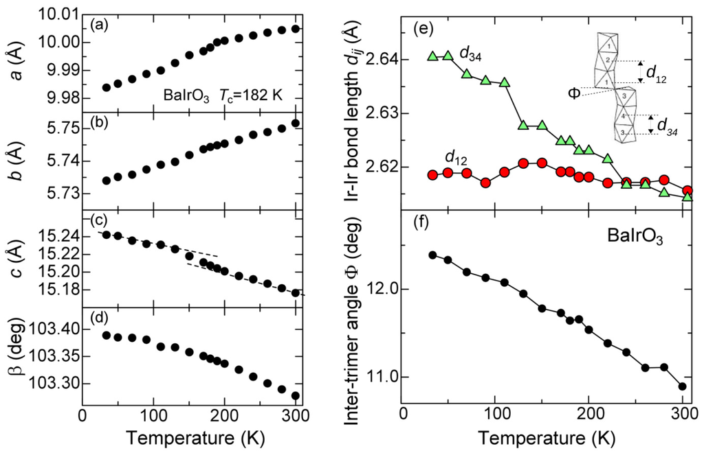 (a–d) lattice parameters of BaIrO3. (a) a-; (b) b-; and (c) c-axis length; (d) monoclinic angle β; (e) The intra-timer Ir-Ir bond length and ; and (f) the inter-timer angle Φ. The inset schematically designates , and Φ.
