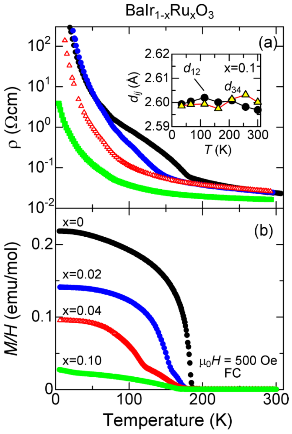 The impurity effect on the 182-K transition. (a) resistivity ρ of polycrystalline samples of BaIr1−xRuxO3. The inset shows the intra-trimer Ir-Ir bond lengths for the sample. The two trimers have the identical, temperature-independent bond length; (b) magnetization M divided by an external field H of 500 Oe of the same samples.
