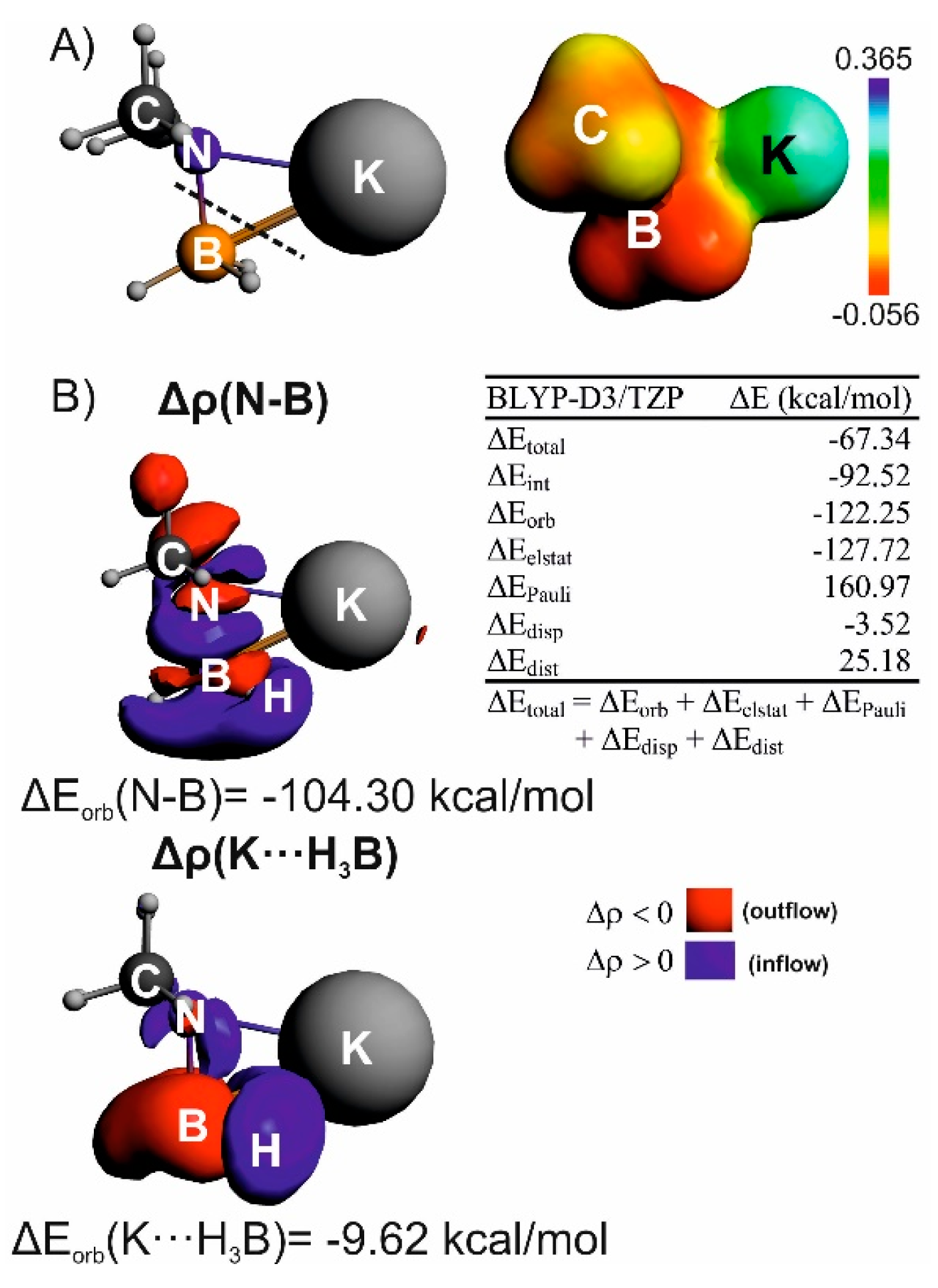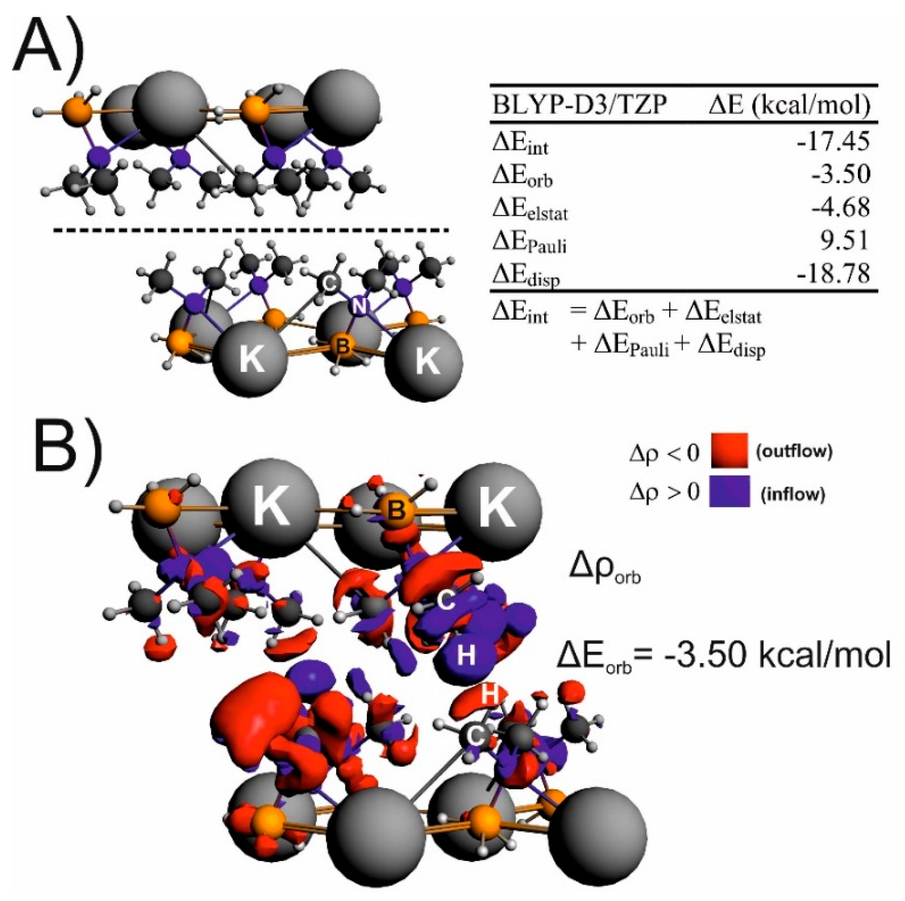 - Mitoraj, M. Bonding in Ammonia Borane: An Analysis Based on the Natural Orbitals for Chemical Valence and the Extended Transition State Method (ETS-NOCV). J. Phys. Chem. A 2011, 115, 14708–14716. [Google Scholar] [CrossRef] [PubMed]