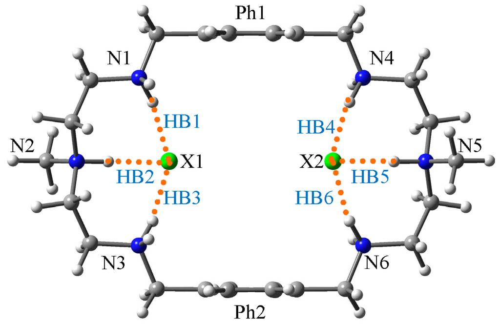 The azamacrocycle ring shows an ellipsoid structure, of which two methyl groups are trans-orientated. As shown in Figure 1, all six nitrogen atoms (from N1 to N6) are fully protonated. Studies show that two halide anions can be encapsulated in the azamacrocyclic cavity, forming stable 1:2 (ligand:anion) complexes [13]. Here we use the width and height values to describe the approximate size of the cavity. The atomic distance between N2 and N5 is used to represent the width of the azamacrocycle. The two aromatic benzene planes are parallel. The distance between the two parallel planes is used to describe the height of the cavity. The optimized cavity of the azamacrocycle has the width of 9.966 Å and height of 6.838 Å. The fully-optimized structures of the halide-encapsulated azamacrocyclic complexes display symmetric geometry (C2h). Six related hydrogen bonds are formed between the halides and the six neighboring protonated amine nitrogen for the complex, HB1, HB2, HB3, HB4, HB5, and HB6. Due to the structural symmetry, hydrogen bonds (HB4, HB5, HB6) have the same properties as hydrogen bonds of HB1 HB2, and HB3 (Figure 1). Therefore, in the following discussions, only HB1, HB2, and HB3 will be discussed in detail to avoid redundancy.