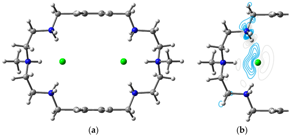 - Hossain, M.A.; Saeed, M.A.; Fronczek, F.R.; Wong, B.M.; Deay, K.R.; Mendy, J.S.; Gibson, D. Charge-assisted encapsulation of two chlorides by a hexaprotonated azamacrocycle. Cryst. Growth Des. 2010, 10, 1478–1481. [Google Scholar] [CrossRef] [PubMed]