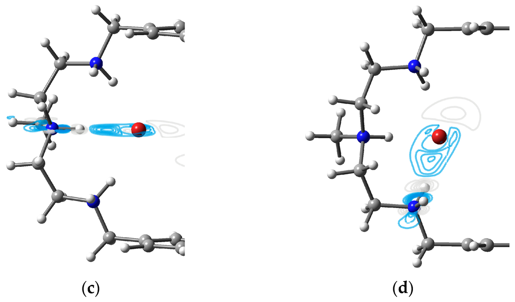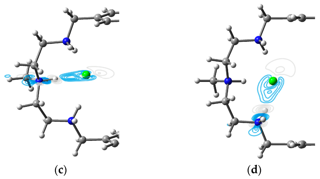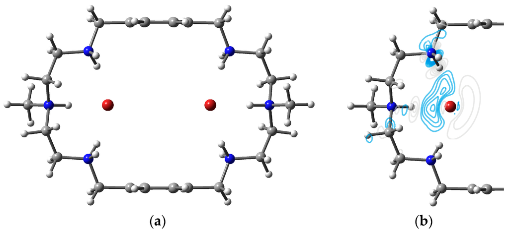As depicted in Figure 3a, the optimized structure of compound [H6LBr2]4+ has a C2h symmetric geometry. The size of the azamacrocycle cavity in this compound is measured by width of 10.705 Å and height of 8.054 Å, which show that the paralleled aromatic benzene planes are parted farther, and N2 and N5 becomes closer with a shorter atomic distance when comparing to those of [H6LCl2]4+ complexes. The two bromides are separated by about 5.683 Å. The atomic distance of N1H…Br and N3H…Br for HB1 and HB3 are calculated to be 2.311 Å and 2.309 Å, respectively. Both of the corresponding densities of BCPs is ~0.026 au and the Laplacian of density through AIM analysis is around 0.013 au. Comparison with HB1 and HB3, HB2 demonstrates a shorter atomic distance for N2H…Br (2.233 Å) and a larger density of BCP (0.0319 au) and a larger Laplacian of density (0.0143). This implies that hydrogen bond HB2 is stronger than hydrogen bonds of HB1 and HB3. The electron density differences maps also reveal a stronger HB2, where the electron density increases along N2H…Br of HB2 (Figure 4c) more than those along N1H…Br of HB1 and N3H…Br of HB3 (Figure 3b,d).